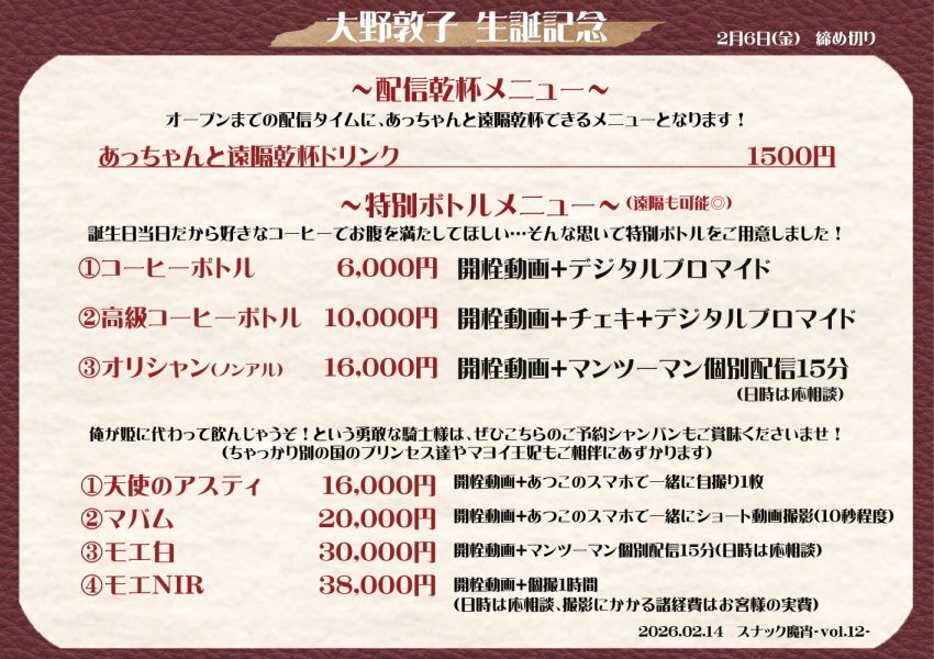 そして今回、2月14日は大野敦子のリアルバースデーという事でスペシャル特典付き特別ボトルも用意してございます。